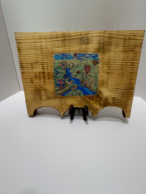 This vibrant wood artwork celebrates the breathtaking spectacle of the Albuquerque International Balloon Fiesta. At its heart is a richly detailed hand colored engraving of dozens of hot air balloons drifting above the verdant Bosque and the sinuous Rio Grande. The natural wood grain serves as both canvas and frame lending warmth and texture that enhance the vibrancy of the scene. A gracefully curved base cutout adds an element of handcrafted elegance underscoring the uniqueness and artistry of the piece.