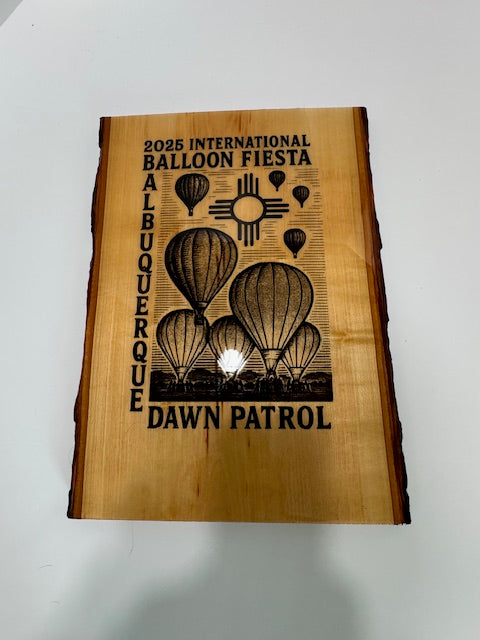 This beautifully engraved live-edge wood plaque pays homage to one of New Mexico's most iconic celebrations: the 20258 Albuquerque International Balloon Fiesta. Featuring bold vertical and horizontal typography. The composition frames a vivid laser etched depiction of hot air balloons ascending into the morning sky capturing the magic of the festival's famed Dawn Patrol. At its center, the design is grounded by the timeless Zia sun symbol - a powerful emblem of harmony and heritage- anchoring this piece in both time and place.