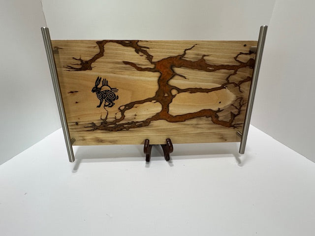 This unique serving tray is a masterful blend of rustic charm and symbolic artistry. Crafted from light toned wood the surface is electrified with dramatic Lichtenberg figures- Lightning like patterns burned in the grain that gives the piece an organic high energy aesthetic. Sleek stainless steel handles on either side contrast the natural wood adding a cotemporary touch. At the heart of the design a tribal style jackrabbit is engraved with bold circular motifs and a Zia inspired outline.