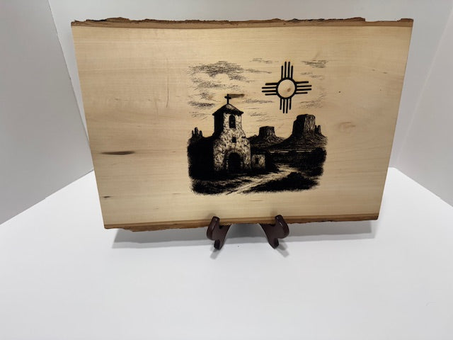 This evocative wall art piece captures the soul of the Southwest with timeless elegance. Laser engraved on a natural Live-edge wood panel. The artwork features a rustic adobe mission style church nestled against the dramatic backdrop of mesas and desert cliffs. Above, the iconic Zia sun symbol radiates with cultural pride tying the image to New Mexico's rich heritage. The high contrast engraving brings depth and dimension to the serene desert scent while the natural wood grain adds warmth.