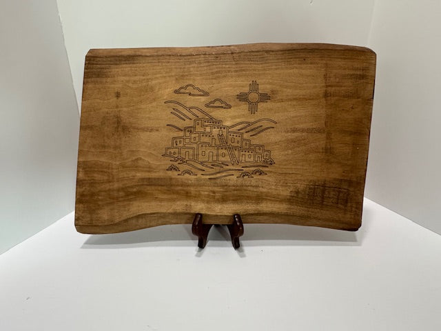 This elegant wooden plaque honors the architectural and cultural heritage of the American Southwest. Expertly engraved into a warm, richly toned slab of live-edged wood is a minimalist depiction of a pueblo village featuring stacked adobe structures, flat roofs and traditional ladders all set beneath sweeping desert clouds. Above this serene tableau, the Zia sun symbol radiates prominently serving as a spiritual and regional anchor. The crisp deliberate lines of the engraving stand in striking contrast to the organic wood grain resulting in a piece that is both timeless and deeply rooted in place.
