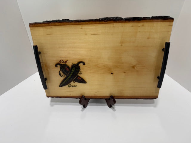 Bold, whimsical and and deeply rooted in New Mexican identify. This handcrafted serving tray embodies the vibrant soul of the southwest. Made from a smooth, light toned slab of wood with a gracefully preserved live edge. The design includes robust bland handles that offer both durability and ease of use. At its center lies a laser engraved and color infilled image of two chile peppers - one red, one green. labeled with the playful and iconic terms "Red" and "Green". This tribute to New Mexico's famed chile culture transforms the tray into a delightful conversation piece as well as a function work of art.